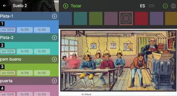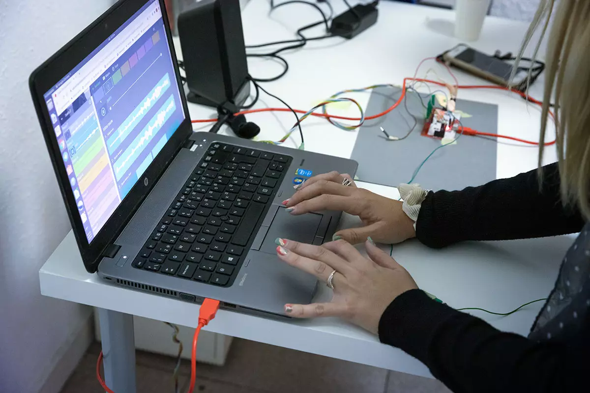 The aim of the workshop was to introduce us in a practical way to remixing and sampling through the body. During the session, each of the four working groups was creating sound pieces with play.antropoloops and thinking of a choreography to perform their piece with a musical floor set up for the occasion.