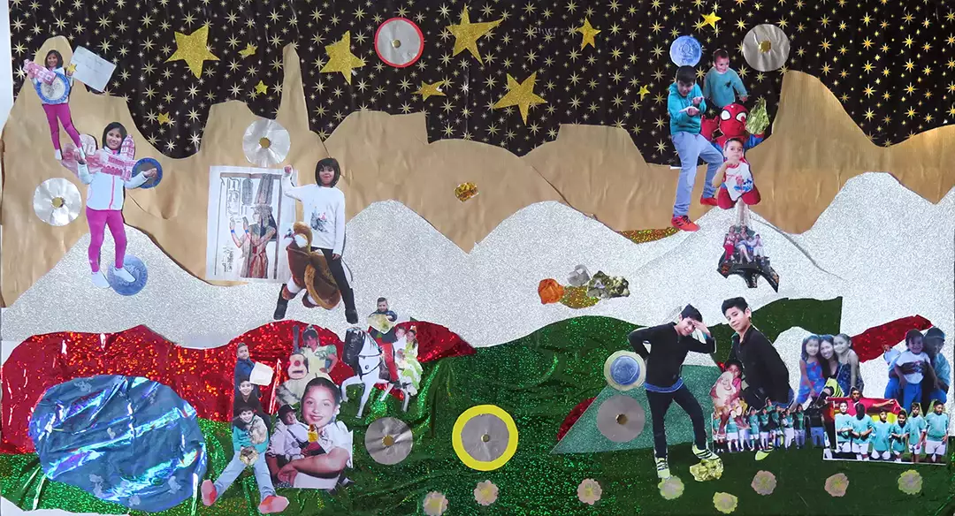 Tras trabajar en el CEIP San José Obrero, un colegio público en el barrio con mayor diversidad cultural de Sevilla, los collages musicales comenzaron a cargarse de rostros, historias y vivencias. Comenzamos a mirar al mundo desde el archivo creado con las personas que trabajamos: del aula, al cole, al barrio, a la ciudad y al mundo.