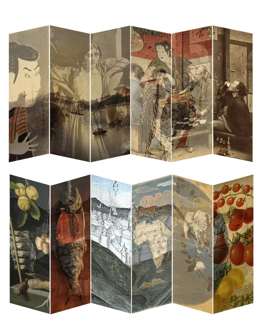 La mesa y la pantalla toman la forma de un biombo japonés, un Rokkyoku byōbu de 6 paneles. En estos dos biombos, los ingredientes musicales y culinarios de esta composición festiva e imaginaria dialogan tan lejos tan cerca.